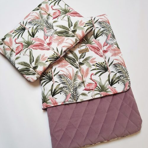 Komplet ŚREDNIAKA koc 75×100 cm, poduszka 30×40 cm Flamingi w kwiatach Velvet smoky lawenda pikowany caro