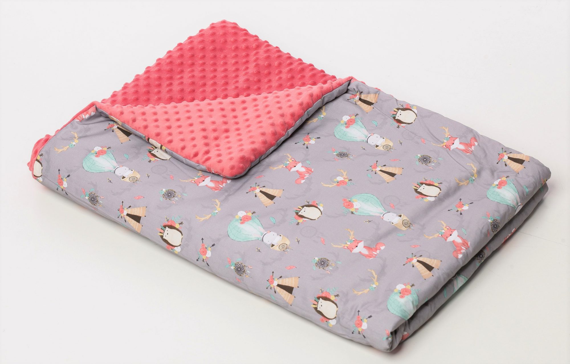 Wypełniony jest antyalergiczną włókniną. Kocyk przeznaczony jako kołderka do łóżeczka, na popołudniową drzemkę, ulubiona kołderka na wszelkie wyjazdy lub przykrycie lóżka przedszkolaka.